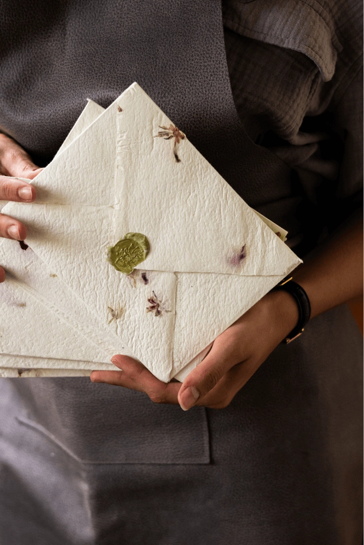 Our handmade paper isn't just a material; it's art in itself. Every sheet is the result of a careful process of handcrafting, where traditional techniques blend with modern innovations to create an unforgettable experience. Each piece of paper bears a unique texture and character, making it perfect for your special occasion. One of the most beautiful aspects of our handmade paper is its customizability. Each sheet of paper can be tailored to your wishes and needs, creating unique designs that reflect your individuality and style. Our handmade paper adds an irreplaceable touch of elegance to every piece in our wedding collection. Its texture, color, and quality create a sense of luxury and distinction, making your invitations and wedding details unforgettable and impressive. For those who prefer alternatives to handmade paper, we also offer a selection of premium-quality papers. These papers are carefully chosen for their exceptional quality, offering a luxurious feel and impeccable finish. Whether you desire a smooth texture, a subtle sheen, or a rich weight, our high-quality papers provide a beautiful canvas for your stationery designs.